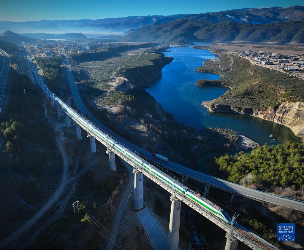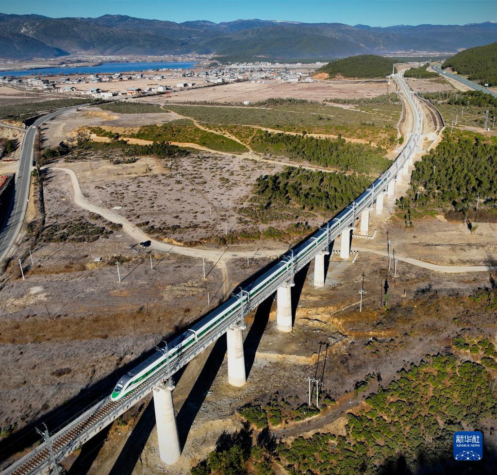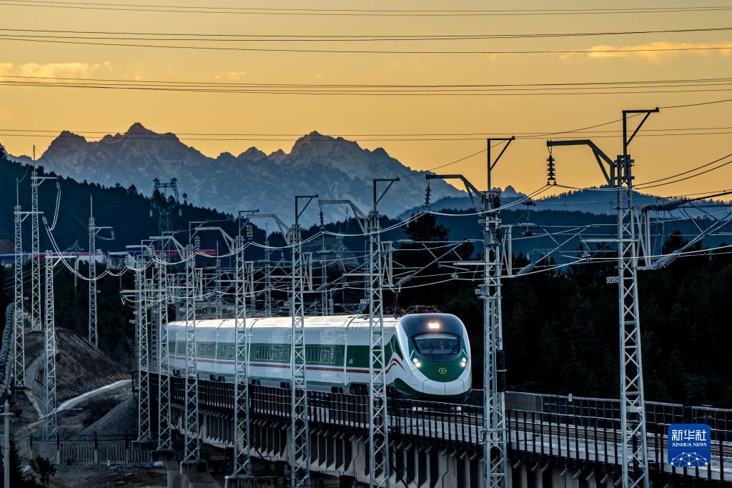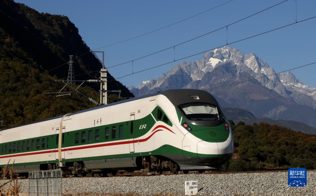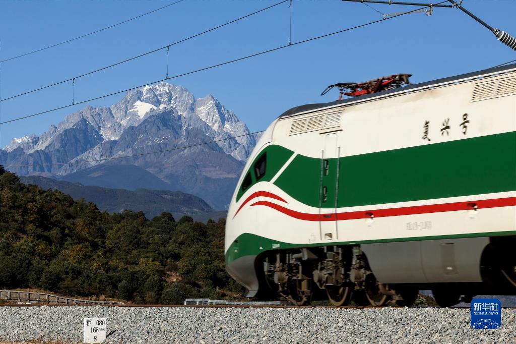 11月26日,列車從玉龍雪山腳下駛過(guò)。新華社記者 邢廣利 攝