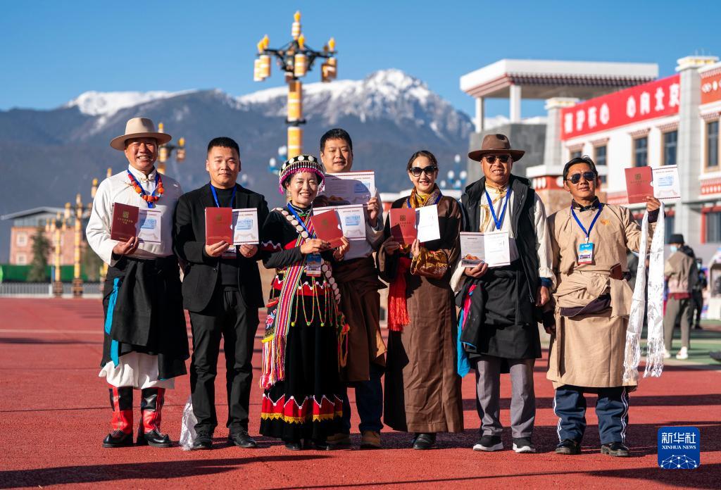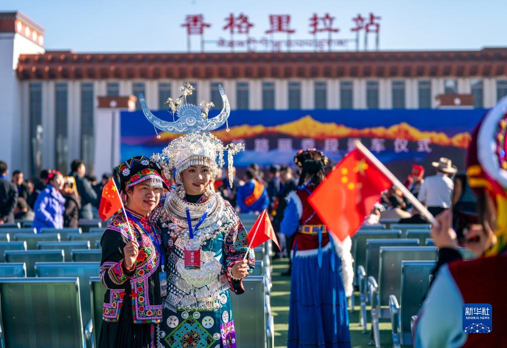 11月26日,參加麗香鐵路開(kāi)通儀式的少數(shù)民族代表在開(kāi)通儀式上拍照留念。新華社記者 陳欣波 攝