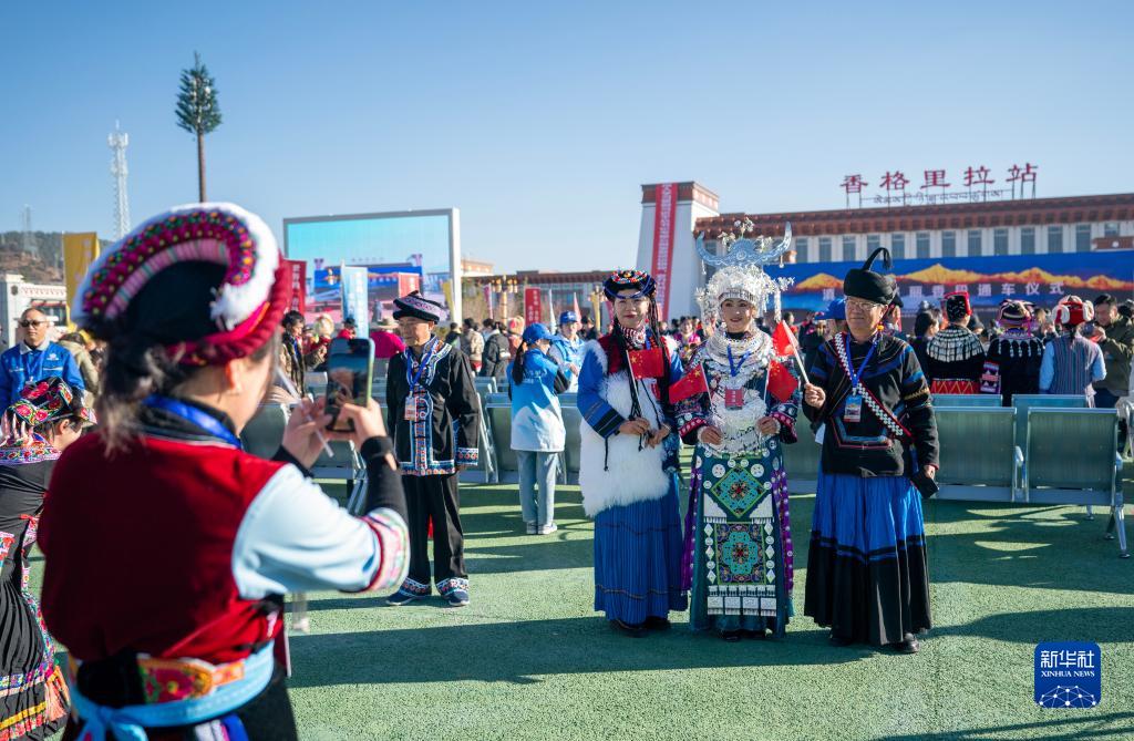 11月26日,參加麗香鐵路開(kāi)通儀式的少數(shù)民族代表用手機(jī)拍照留念。目前,中國(guó)移動(dòng)已實(shí)現(xiàn)麗香鐵路及沿線周邊區(qū)域4/5G信號(hào)100%覆蓋。新華社記者 陳欣波 攝