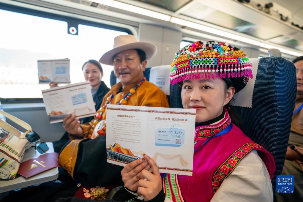 11月26日,乘坐麗香鐵路開(kāi)通首發(fā)列車的嘉賓在車廂內(nèi)展示紀(jì)念車票。新華社記者 陳欣波 攝