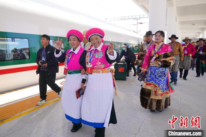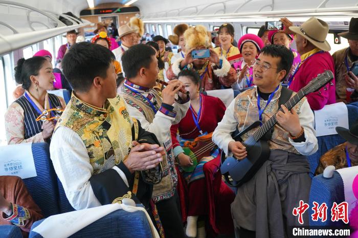 11月26日,麗江至香格里拉鐵路正式建成通車(chē)。圖為乘客載歌載舞慶祝鐵路通車(chē)。中新社記者 劉冉陽(yáng) 攝