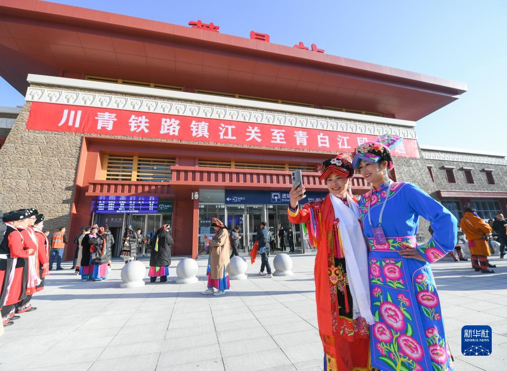 11月28日,在川青鐵路茂縣站,當(dāng)?shù)馗髯迦罕娫谡厩皬V場(chǎng)慶祝鐵路開(kāi)通運(yùn)營(yíng)。新華社記者 王曦 攝
