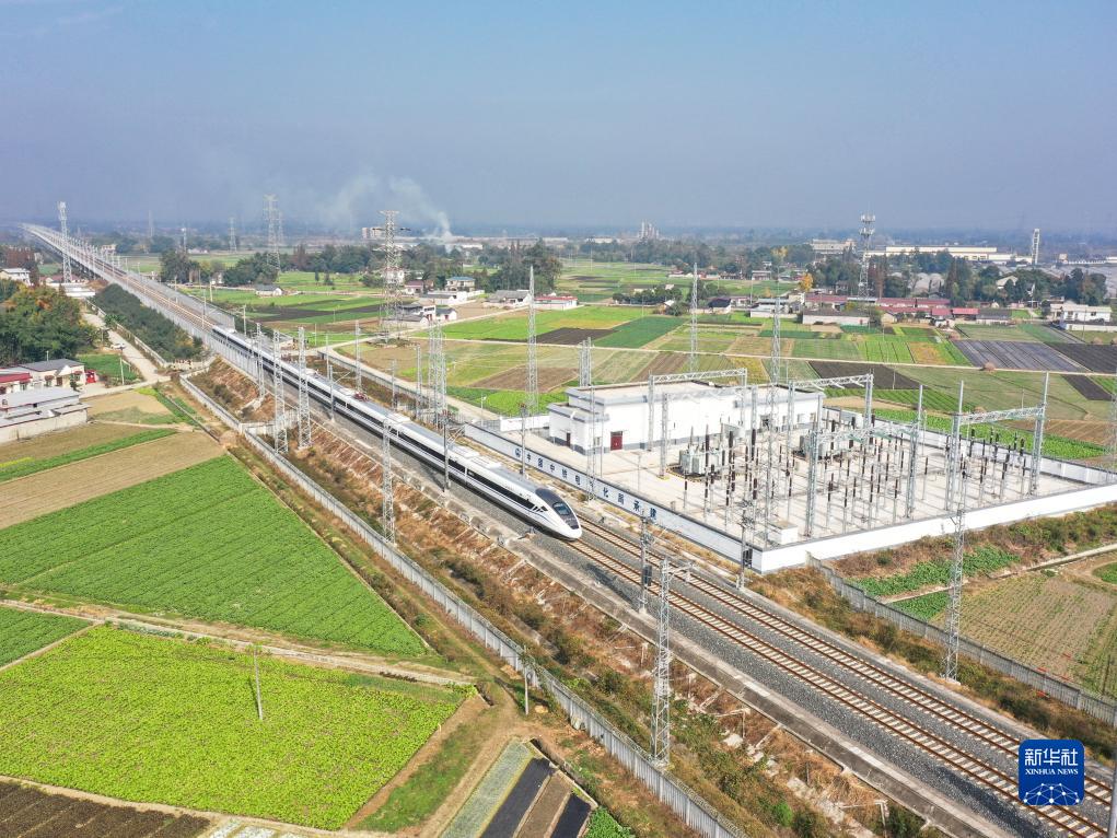 11月28日,在成都市青白江區(qū)境內(nèi)拍攝的行駛在川青鐵路上的列車(上)和行駛在西成高鐵線上的列車(下)(無(wú)人機(jī)照片)。新華社記者 王曦 攝
