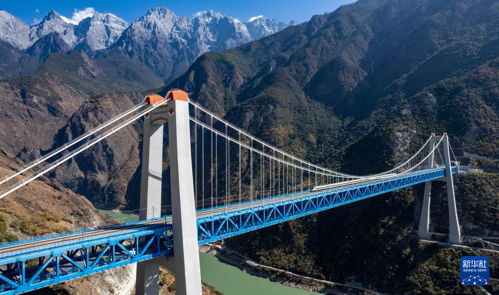 1月24日,列車通過虎跳峽金沙江鐵路大橋,遠處是玉龍雪山(無人機照片)。新華社記者 陳欣波 攝