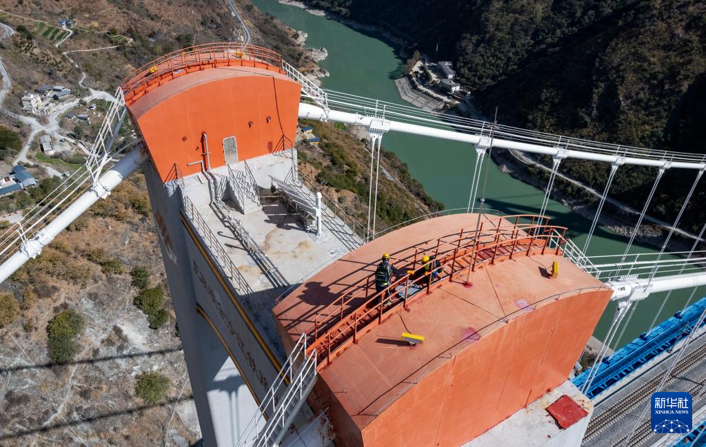 1月24日,工區(qū)職工劉榕基和工區(qū)班長楊應文在主纜巡檢。新華社記者 陳欣波 攝
