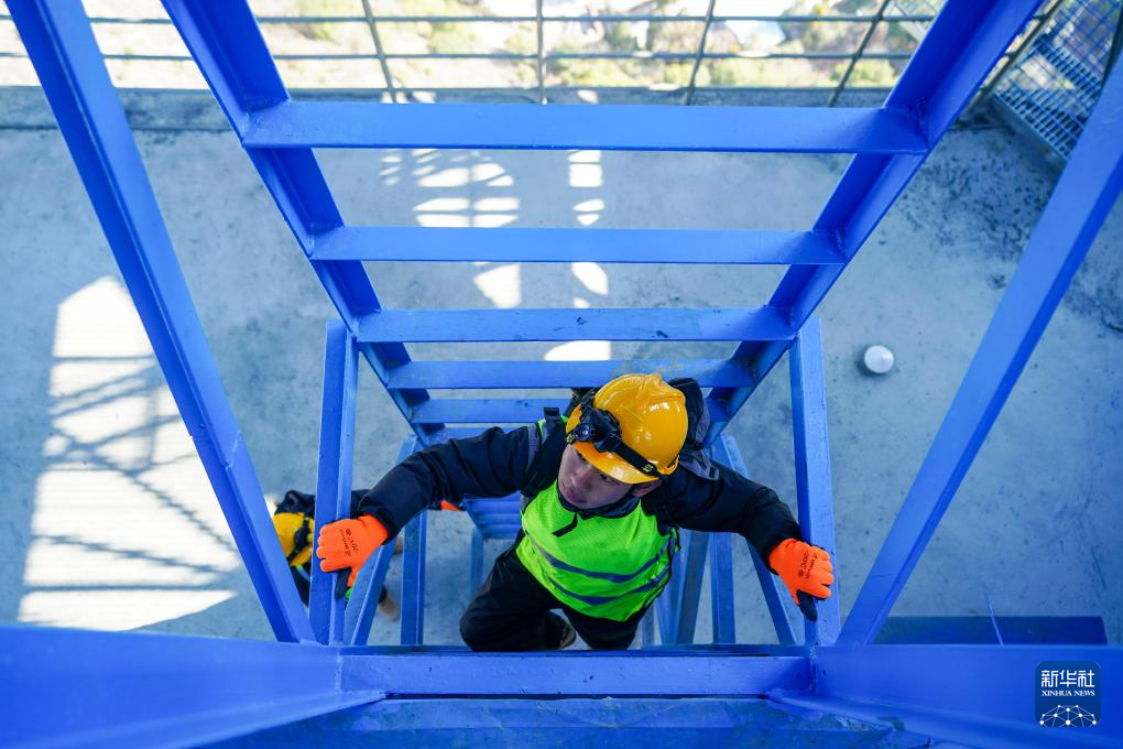 1月24日,工區(qū)職工趙澗泉在通過檢修爬梯。新華社記者 陳欣波 攝