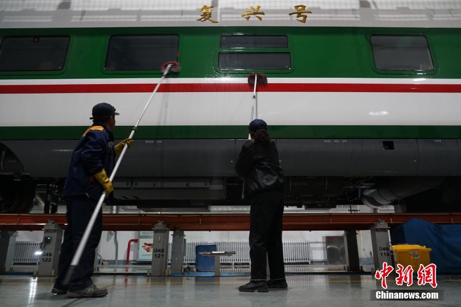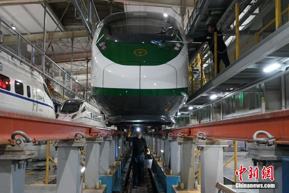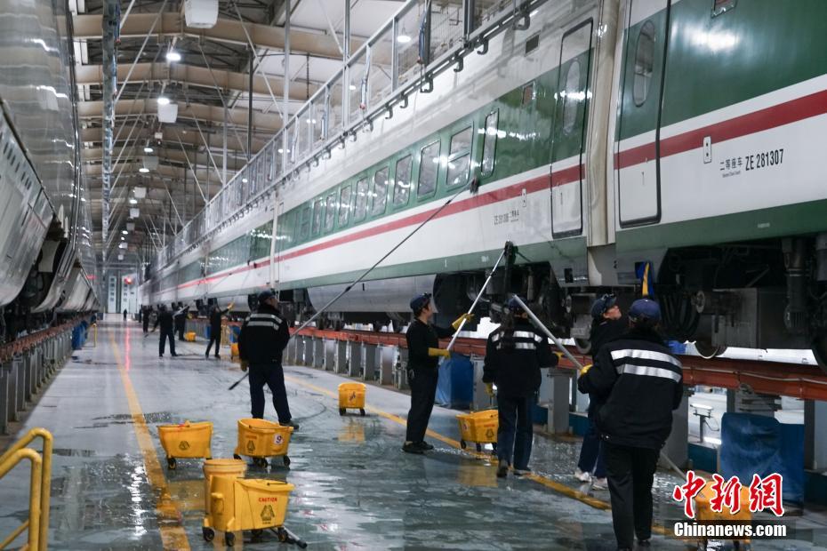 1月30日晚,在青藏鐵路公司西寧車(chē)輛段動(dòng)車(chē)運(yùn)用車(chē)間,工作人員在無(wú)電作業(yè)時(shí)進(jìn)行動(dòng)車(chē)清潔。中新社記者 馬銘言 攝
