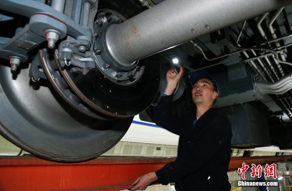 1月30日晚,在青藏鐵路公司西寧車(chē)輛段動(dòng)車(chē)運(yùn)用車(chē)間,地勤機(jī)械師在無(wú)電作業(yè)時(shí)進(jìn)行動(dòng)車(chē)組走行部關(guān)鍵部位的檢修。中新社記者 馬銘言 攝