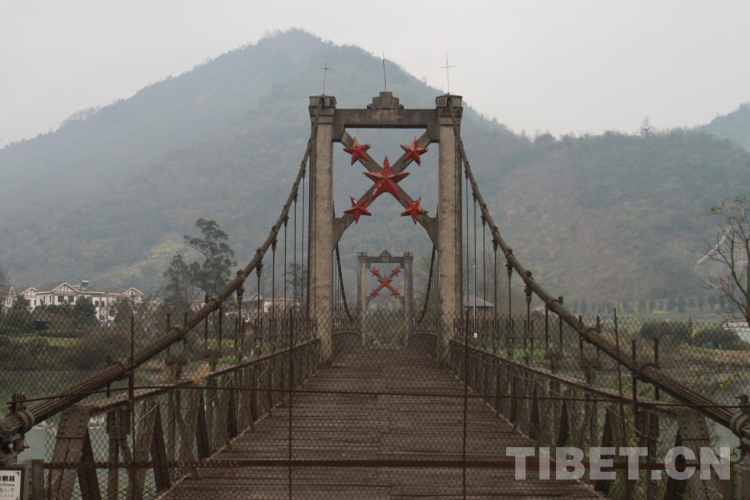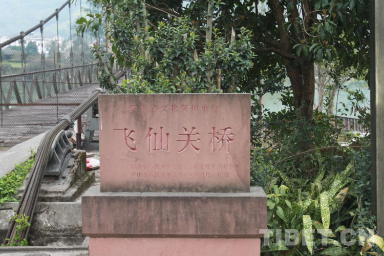 站在橋邊,遙望蜿蜒的江水就是青衣江,飛仙關(guān)橋全長164米,寬4.5米,索塔為鋼筋混凝土門式框架,高29米,流動式索鞍,策略式索錠,當(dāng)時的設(shè)計載重為15噸。橋柱橫額上有時任西南軍政委員會主席劉伯承所題寫的橋名——“飛仙關(guān)橋”。橋西岸塔柱有時任十八軍政委譚冠三題寫的檻聯(lián)——“發(fā)揮天才,發(fā)揮力量,戰(zhàn)勝困難,創(chuàng)造人民幸福,一面進(jìn)軍,一面建設(shè)解放西藏,鞏固西南國防”的字樣。東岸塔柱上有時任西康省主席廖志高題寫的檻聯(lián)——“勞動創(chuàng)造世界飛仙天險何難克服,革命帶來幸福閉塞邊區(qū)從此繁榮”字樣。橋上五顆閃閃的紅星,映照著飛仙關(guān)的繁榮,也印證著革命前輩們的美好愿景已經(jīng)變?yōu)楝F(xiàn)實。