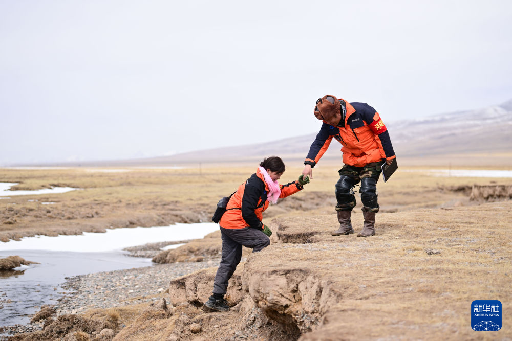 3月21日,葉金俄日(右)在渡過(guò)冰河后等待妻子?xùn)|木措。新華社記者 張龍 攝