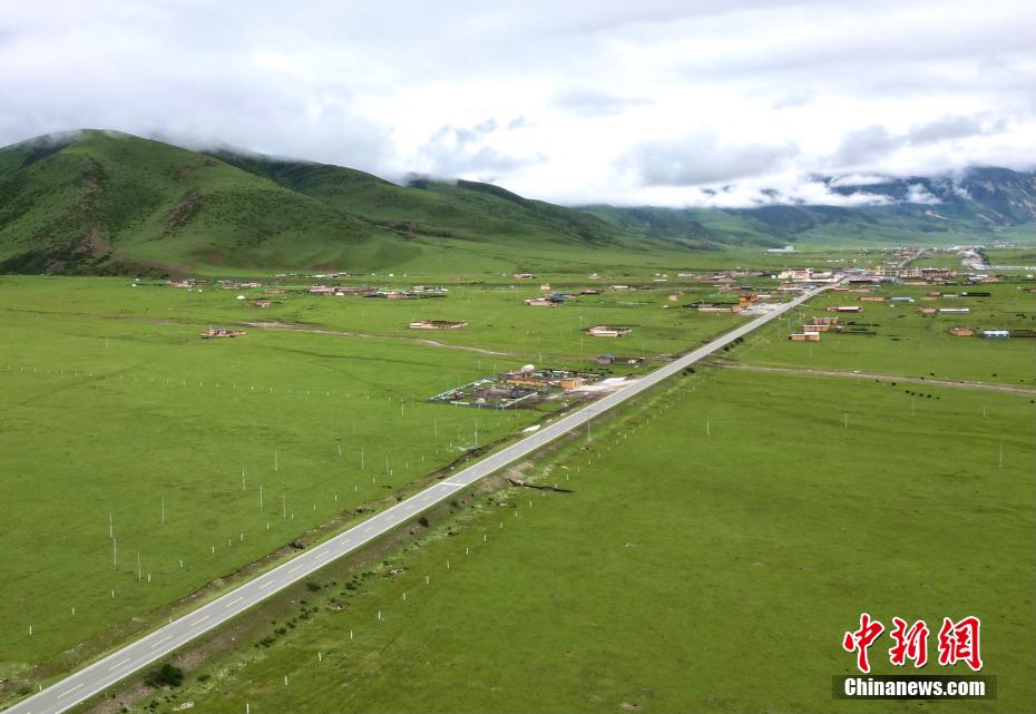 圖為6月26日,國(guó)道318線(xiàn)在毛埡草原上延伸。(無(wú)人機(jī)照片)中新社記者 王磊 攝