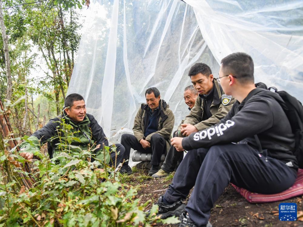在四川白河國家級自然保護區(qū),唐玉林(左一)和巡護隊員一起在搭建的簡易塑料蓬內短暫休息交流(10月11日攝)。新華社記者 王曦 攝