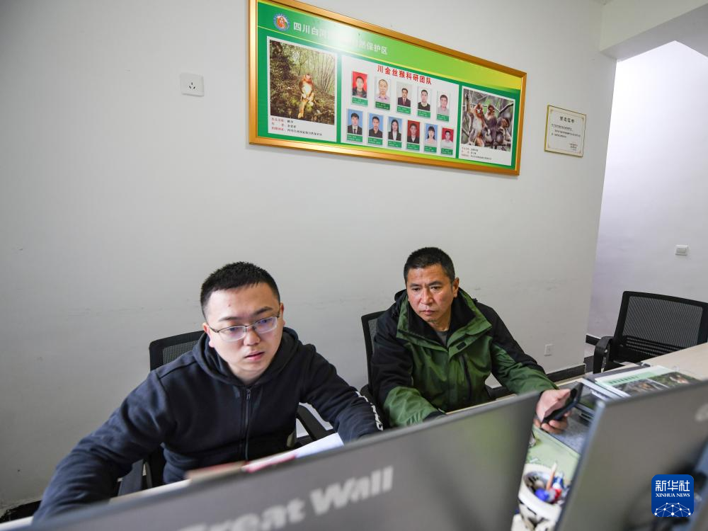在四川白河國家級自然保護區(qū),唐玉林和西華師范大學生物學研究生劉昕在辦公室將巡護記錄的資料錄入電腦系統(10月11日攝)。新華社記者 王曦 攝