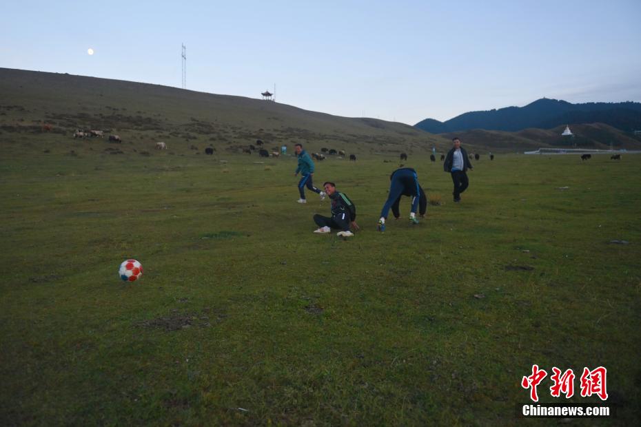 10月15日,在甘肅省甘南藏族自治州合作市一牧場(chǎng)內(nèi),甘南九二聯(lián)隊(duì)足球隊(duì)員進(jìn)行訓(xùn)練。該足球隊(duì)已成立32年,由牧民、務(wù)工者、歌舞演員、個(gè)體戶、老師、學(xué)生等組成,如今已歷經(jīng)三代球員的成長(zhǎng)。