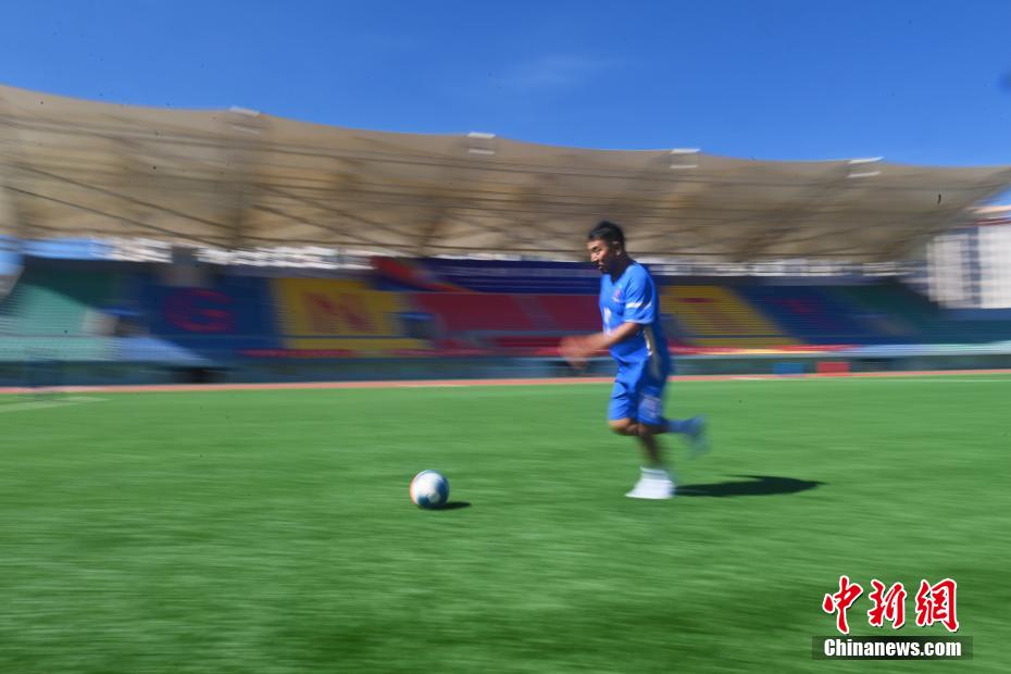 10月15日,在甘肅省甘南藏族自治州合作市一足球場(chǎng)內(nèi),隊(duì)員更高才讓(左)進(jìn)行訓(xùn)練。更高才讓是當(dāng)?shù)啬撩?,曾拿到甘肅省運(yùn)會(huì)足球賽最佳射手,他表示自己在足協(xié)杯用體力優(yōu)勢(shì)彌補(bǔ)了球技不足,因?yàn)榇饲霸谏钌侥羺^(qū)放牛坡度太陡無(wú)法騎馬只能徒步,所以每天近20公里的放牧生活造就了他的體力優(yōu)勢(shì)。