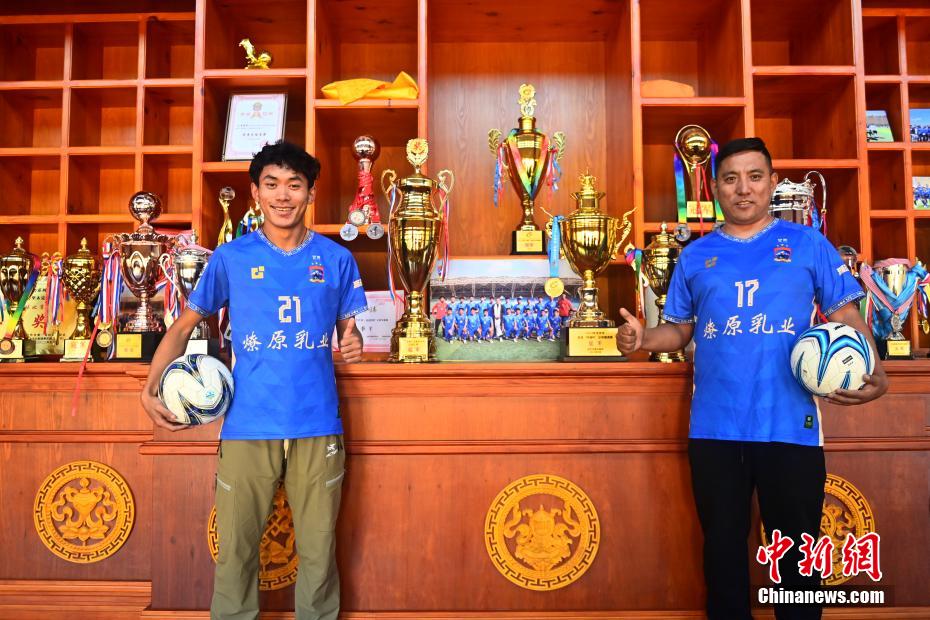 10月14日,在甘肅省甘南藏族自治州合作市甘南九二聯(lián)隊(duì)俱樂(lè)部榮譽(yù)展廳內(nèi),隊(duì)長(zhǎng)久西道杰(右)與隊(duì)員更高才讓(左)展示該隊(duì)所獲榮譽(yù)。