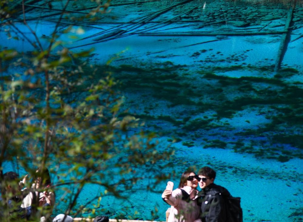 游客在九寨溝景區(qū)觀光留影。新華社記者 王曦 攝