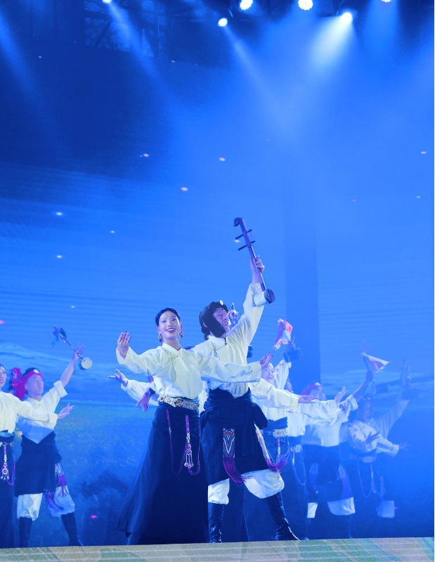玉樹擁有豐富多樣的非物質(zhì)文化遺產(chǎn),于2017年設(shè)立了國家級藏族文化(玉樹)生態(tài)保護(hù)實(shí)驗(yàn)區(qū),這一舉措不僅強(qiáng)化了對藏族文化的保護(hù),也促進(jìn)了當(dāng)?shù)匚幕膫鞒信c發(fā)展。此次展演由開篇、第一章生命之源、第二章文化之魂、第三章五彩的三江源、尾聲五個部分組成,玉樹州民族歌舞團(tuán)精心挑選了玉樹伊舞、熱巴舞、藏族民歌等具有玉樹代表性的13個節(jié)目進(jìn)行了展示。