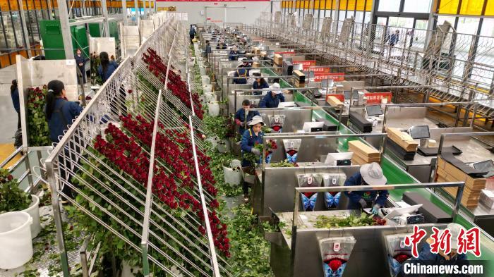 目前,當?shù)亟ǔ擅娣e20萬平方米高新智能化溫室,鮮花四季盛開。記者看到,棚頂紅色的全自動補光燈正在為玫瑰“延長光照時長”。精準控制營養(yǎng)液成分和濃度的智能化水肥一體化系統(tǒng)、自動化分選等高新設備投入,科技種植和品質(zhì)上升,讓臨夏成為中國重要的優(yōu)質(zhì)鮮切花生產(chǎn)基地,日產(chǎn)20萬枝鮮切花,海內(nèi)外訂單不斷。