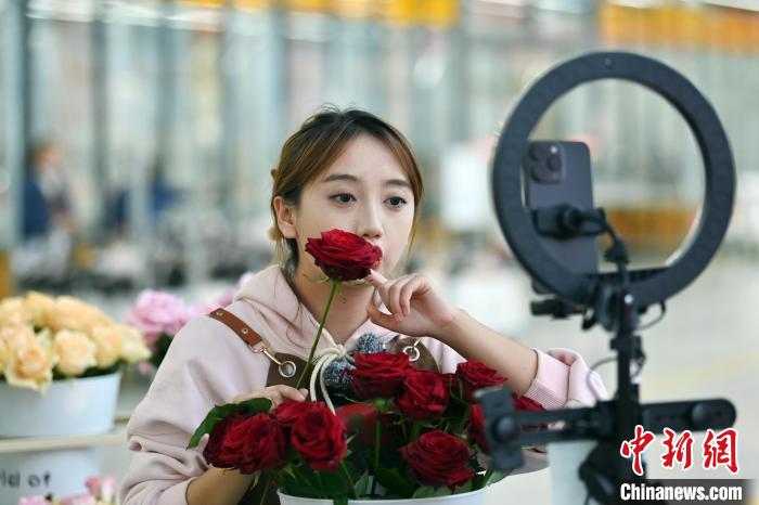 11月20日,在甘肅省臨夏回族自治州臨夏市百益億農(nóng)國際鮮花港內(nèi),工作人員進行網(wǎng)絡直播售賣鮮切玫瑰。九美旦增 攝