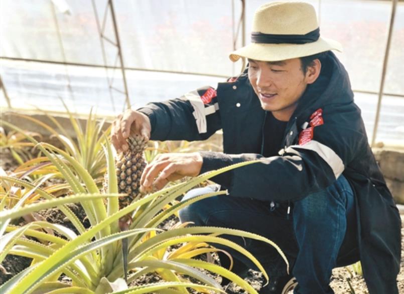 近年來,西藏拉薩曲水凈土健康產(chǎn)業(yè)園加大科技投入,積極引進新產(chǎn)品試驗試種,調(diào)整種植結(jié)構(gòu),拓寬群眾增收渠道。圖為工作人員展示園區(qū)新試種的菠蘿。記者 凃瓊攝