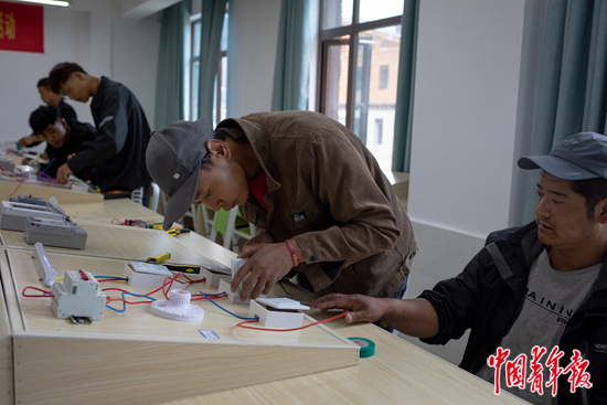 29歲的扎西才登(右二)在電工教室練習(xí)線路組裝。他的家庭是貧困戶,他因聽力障礙,沒有外出打工。村里介紹他來林芝市技工學(xué)校學(xué)習(xí),學(xué)成后可以推薦進(jìn)入企業(yè)就業(yè)。中青報·中青網(wǎng)記者 李雋輝 攝