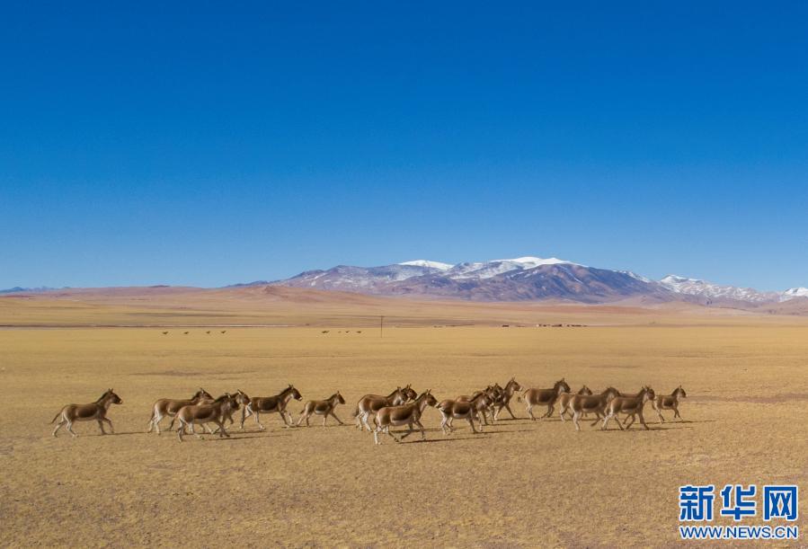 在西藏羌塘國家級自然保護區(qū)拍攝的一群奔跑的藏野驢(2019年12月23日攝,無人機照片)。新華社記者 孫非 攝