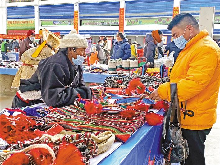 各大展臺(tái)上,牛羊肉、奶渣、酥油等農(nóng)畜產(chǎn)品,蟲草、貝母、人參果等中藥材,各具特色的民族手工藝品等,引得人們流連忘返?!拔覀兊难┑匮ナ羌兪止ぶ谱鞯模っ惑w,這里面是羊毛,很暖和,高筒的180元一雙,低筒的150元一雙,擺攤不到一小時(shí),我們已賣出了8雙。”來自雙湖縣嘎措鄉(xiāng)合作社的羅培笑逐顏開。據(jù)羅培介紹,這是他們合作社第6次參加該展銷會(huì),除了賣手工藝品,他們還賣牛羊肉?!爸挥?jì)算手工藝品,我們每次銷售額都在3萬元左右。”