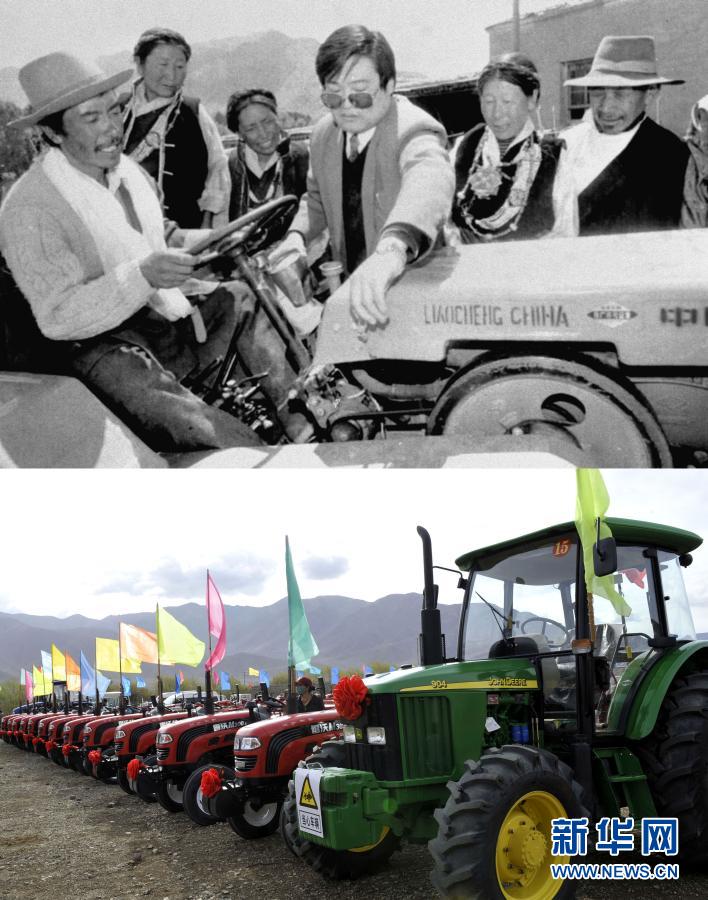 拼版照片:上圖是1996年,山東省援助西藏的首批農機物資日前抵達日喀則。圖為山東援藏干部在給當?shù)夭刈遛r民講解農機具的使用方法(新華社記者 土登 攝);下圖是2012年5月4日,西藏日喀則市白朗縣成為西藏自治區(qū)第一個農業(yè)機械化示范縣。圖為停放在白朗縣田間的農業(yè)機械(新華社記者 多吉占堆 攝)。新華社發(fā)