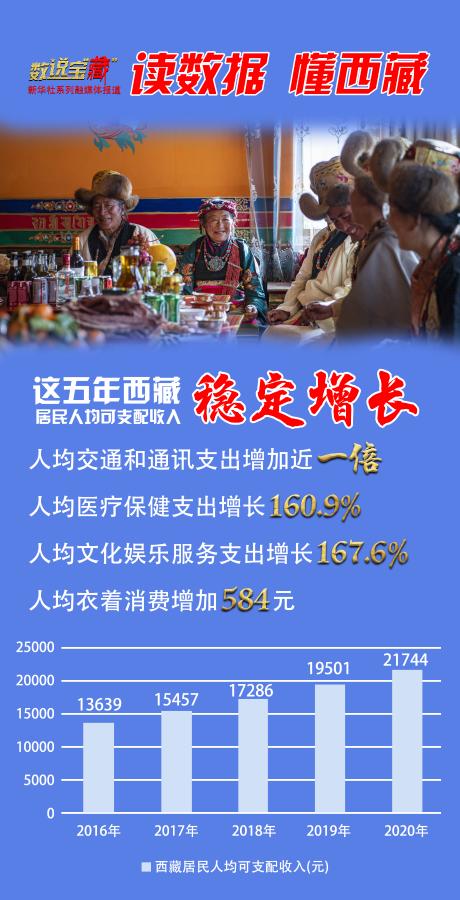 富起來的西藏人民,消費(fèi)實(shí)現(xiàn)升級。“十三五”期間,西藏農(nóng)牧民群眾人均消費(fèi)糧食下降126公斤、消費(fèi)蔬菜提高23公斤,衣著消費(fèi)增加584元,交通和通訊支出增加近一倍,醫(yī)療保健支出增長160.9%,人均文化娛樂服務(wù)支出增長167.6%。
