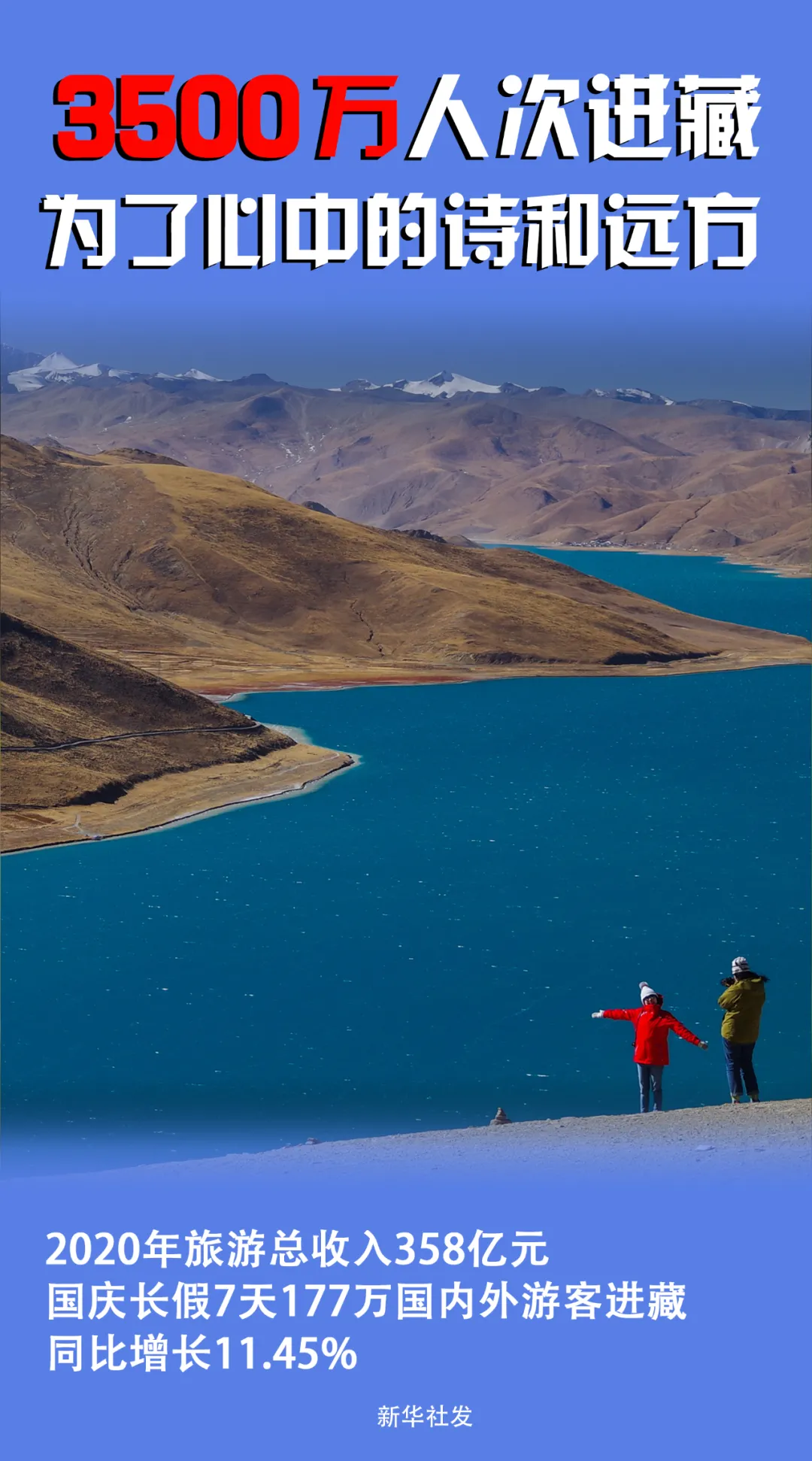 2020年,西藏共接待國內外游客3500萬人次,實現旅游總收入358億元。當年國慶長假前7天,共接待國內外游客177.46萬人次,同比增長11.45%;實現旅游收入9.35億元,同比增長14%。