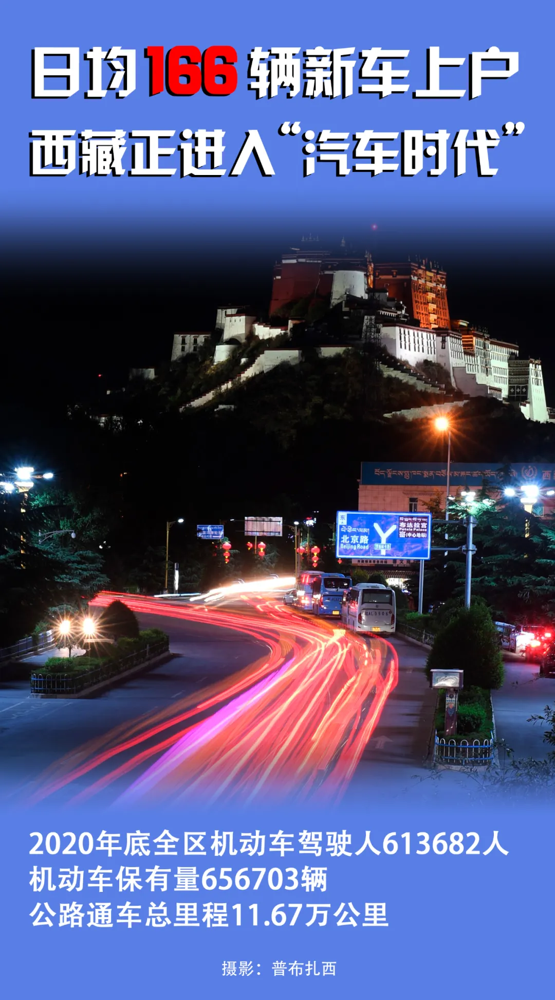 2020年,日均新車上戶166輛;截至當年底,西藏機動車保有量達到656703輛,機動車駕駛人達613682人。西藏公路通車總里程達到11.67萬公里。按照目前拉薩戶籍人口55萬人計算,基本上平均每兩個人就擁有一輛車。