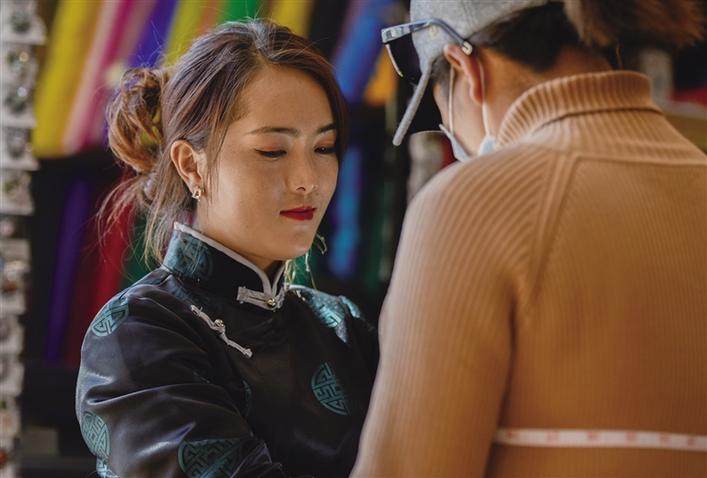“老板,你家還有這款藏裝嗎?我想要一款。”在該店內(nèi),市民卓嘎拿出手機(jī),指著格桑措姆錄制的藏裝短視頻說道?!坝械?,這是我們今年推出的新款,是對傳統(tǒng)的藏裝進(jìn)行了改良,主要是體現(xiàn)在領(lǐng)口處,改良后的藏裝對領(lǐng)口部位進(jìn)行了復(fù)古簡約化設(shè)計(jì),使其兼具美觀性與舒適性,再搭配一個(gè)‘卡烏’堪稱完美?!备裆4肽方榻B道。