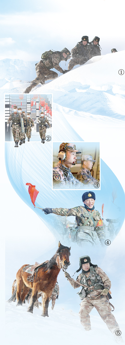 圖①、圖⑤:1月下旬,南疆軍區(qū)某邊防團(tuán)在高原巡邏。