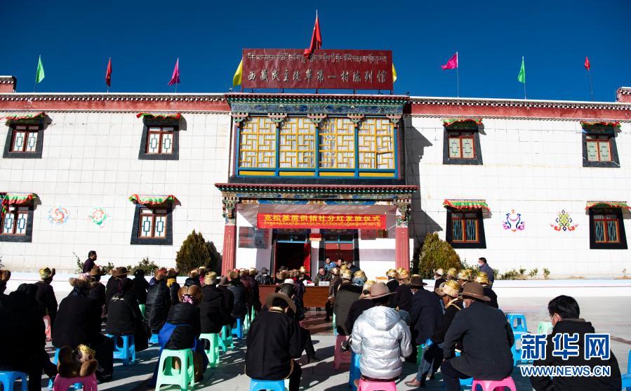 2月9日,西藏自治區(qū)供銷(xiāo)合作社社有企業(yè)——西藏領(lǐng)峰田舍益家公司負(fù)責(zé)人趙全(左一)給當(dāng)?shù)厝罕姲l(fā)放分紅。新華社記者 普布扎西 攝