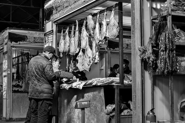 市民在藥王山農(nóng)貿(mào)市場挑選牦牛肉。記者 張雪芳 攝
