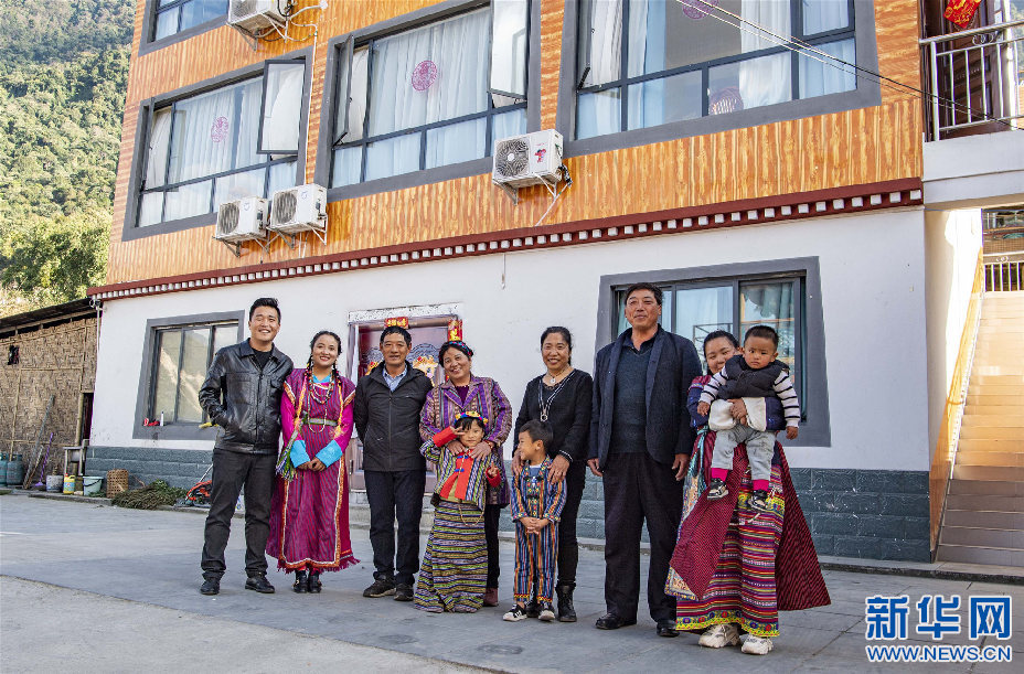 在西藏林芝市墨脫縣,張淳煥一家人在自家的新房前合影(2月11日攝)。新華社記者 孫非 攝