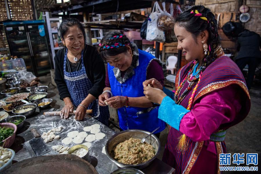 扎西玉珍(右)和母親、婆婆一起包水餃(2月11日攝)。新華社記者 孫非 攝