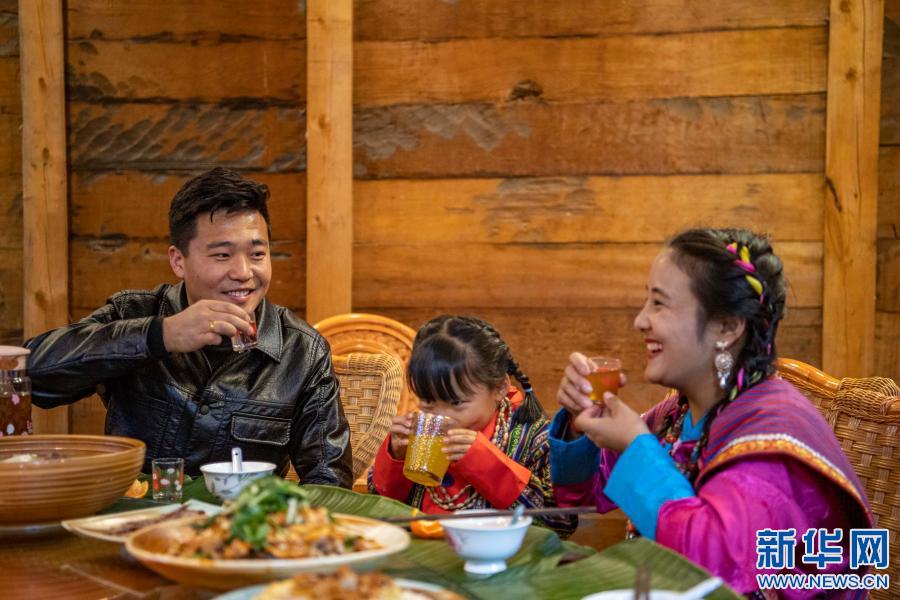 張淳煥一家三口在親戚開(kāi)的農(nóng)家樂(lè)里舉杯共慶新年(2月11日攝)。新華社記者 孫非 攝