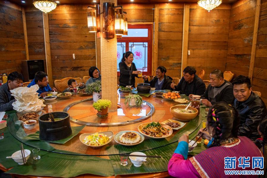 張淳煥一家在親戚開(kāi)的農(nóng)家樂(lè)里吃年夜飯(2月11日攝)。新華社記者 孫非 攝