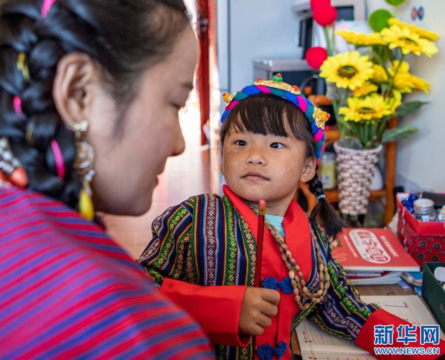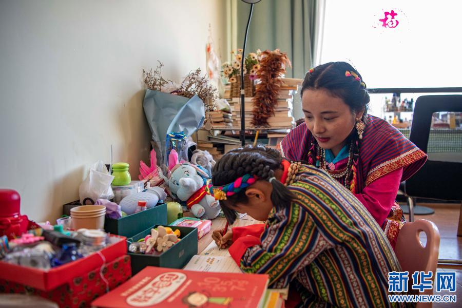 在位于西藏林芝市墨脫縣的家中,扎西玉珍指導(dǎo)女兒寫(xiě)作業(yè)(2月11日攝)。新華社記者 孫非 攝