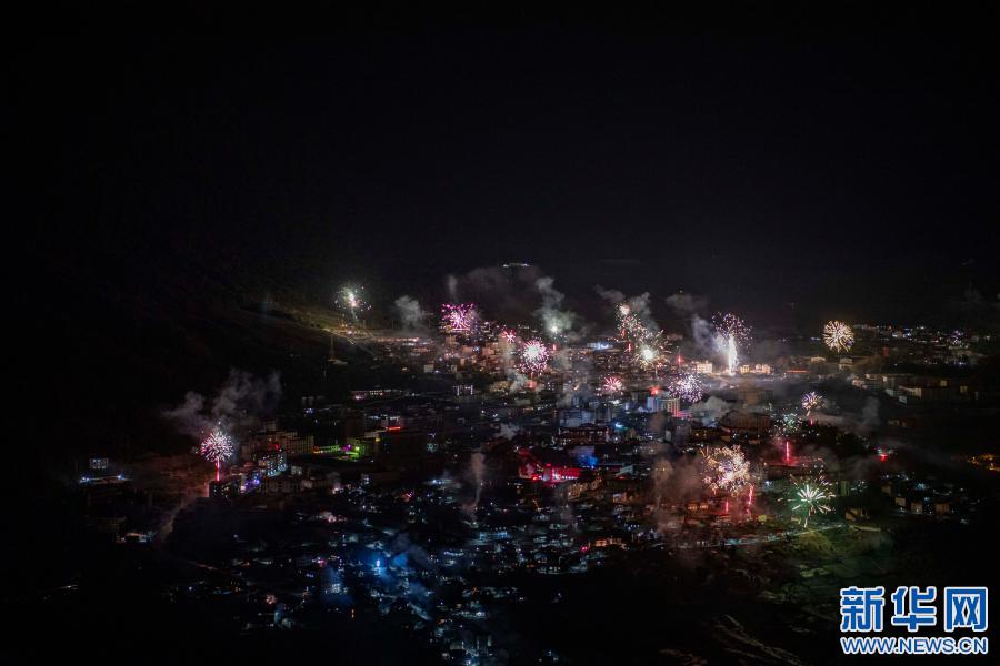 除夕夜,墨脫縣城群眾燃放煙花,慶祝牛年到來(lái)(2月11日攝)。新華社記者 孫非 攝