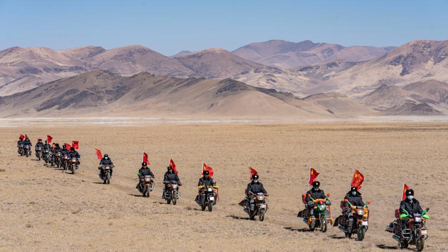 夜幕降臨高原,一天的訓(xùn)練結(jié)束。隊(duì)員們騎著車從鄉(xiāng)里散去,出發(fā)前不忘再緊一緊車尾的國旗。一輪明月懸在喜馬拉雅山脈的群山上,照亮了守邊人的回家路。