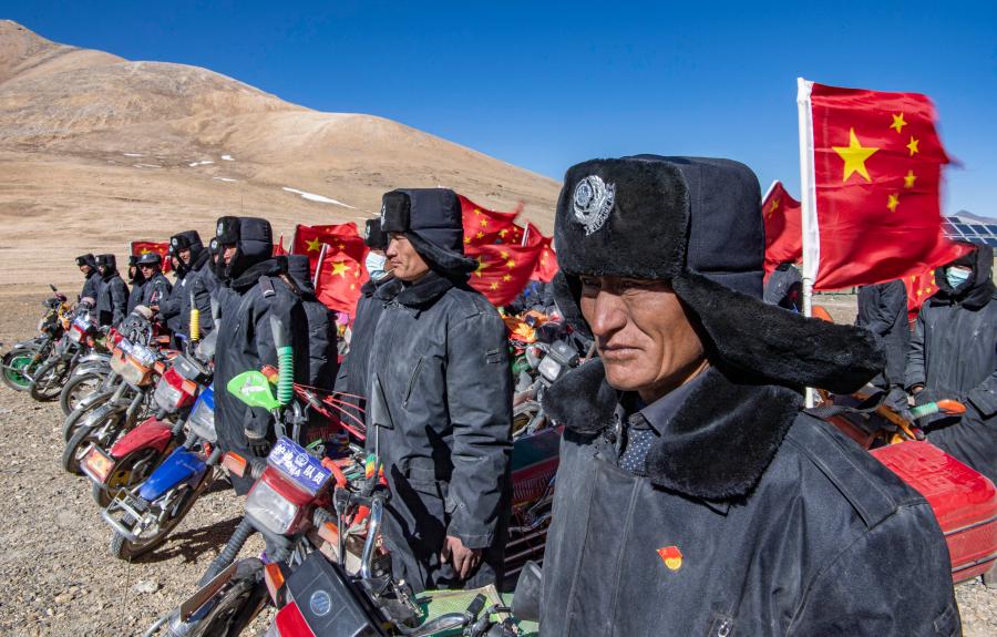 西藏日喀則市薩嘎縣昌果鄉(xiāng)的一處村莊里,48歲的藏族漢子石覺塔布在風(fēng)中跨上一輛摩托車,向平坦無垠的高原邊緣騎去。他的車尾插著一面五星紅旗,被風(fēng)吹得獵獵作響,即便駛出很遠(yuǎn),那抹紅色在車輪卷起的煙塵中也依然醒目。