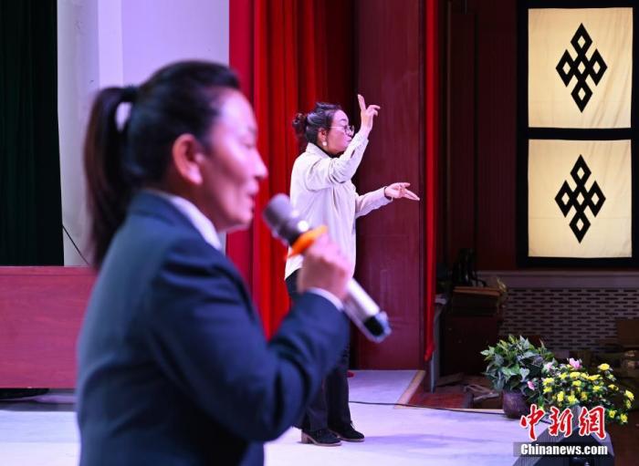 圖為3月11日,拉薩市人民檢察院未成年檢察廳負(fù)責(zé)人普布倉(cāng)覺在做法治宣講,拉薩市特殊教育學(xué)校的手語老師為聾啞學(xué)生翻譯。 中新社記者 趙朗 攝