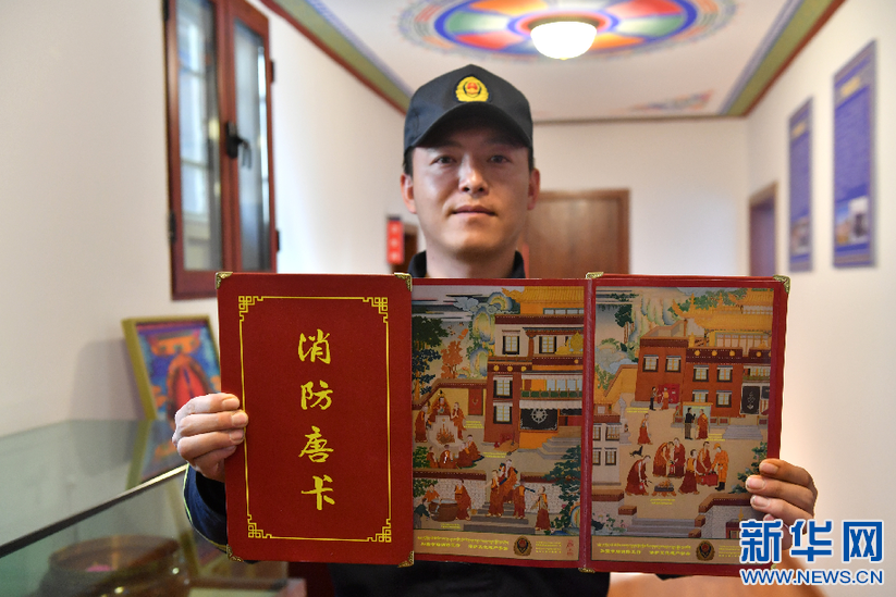 布達(dá)拉宮消防救援大隊二級指揮員喬宣茜展示消防救援大隊推出的消防宣傳唐卡(3月4日攝)。新華社記者 孫瑞博 攝