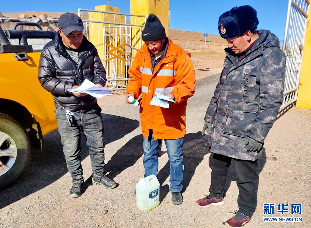 在安多公路養(yǎng)護段家屬院,扎西次仁(左)和同事準備為工區(qū)工作人員發(fā)放疫情防控物資(2月8日攝)。新華社發(fā)(斯塔卓瑪 攝)