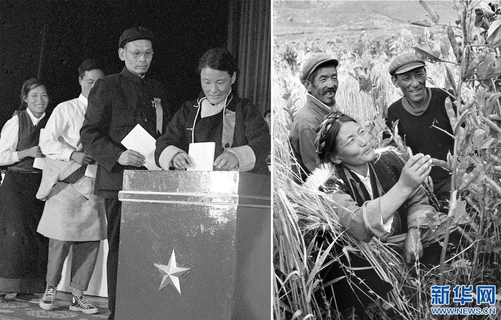 拼版照片:左圖:1965年9月8日,西藏自治區(qū)第一屆人民代表大會第一次會議選舉了西藏自治區(qū)主席、副主席和自治區(qū)人民委員會委員。 次仁拉姆(右一)作為代表正在投票。(新華社資料照片)。右圖:1979年次仁拉姆(前)帶領(lǐng)公社社員開展科學(xué)種田,在田間觀察冬小麥和蠶豆套種情況(新華社資料照片)。新華社發(fā)