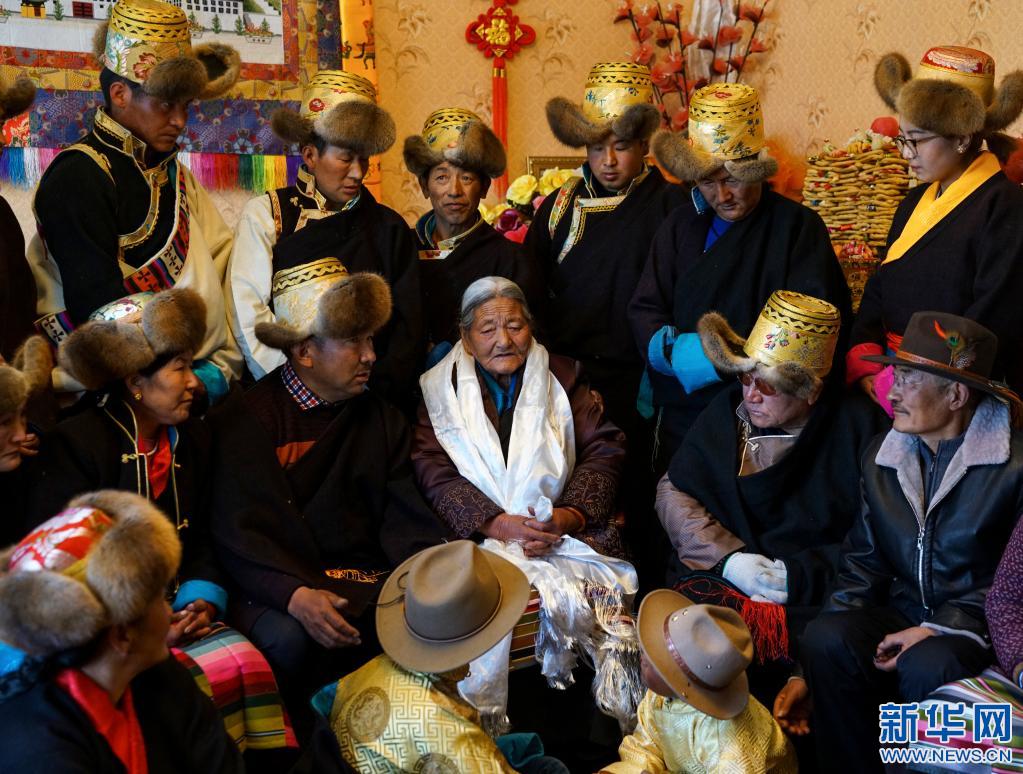 次仁拉姆(中)和互助組成員后代合影(2017年2月28日攝)。新華社發(fā)(車剛 攝)