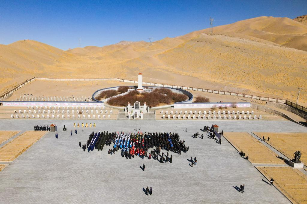 阿里的黨員干部、解放軍、學生及群眾,聚集在獅泉河烈士陵園里緬懷先烈。(2021年4月4日 新華社記者張兆基 攝 無人機照片)